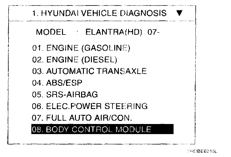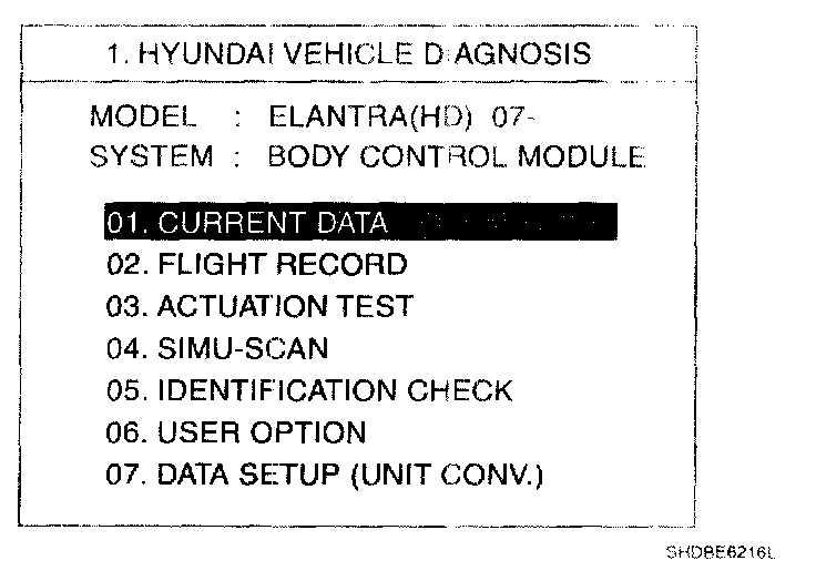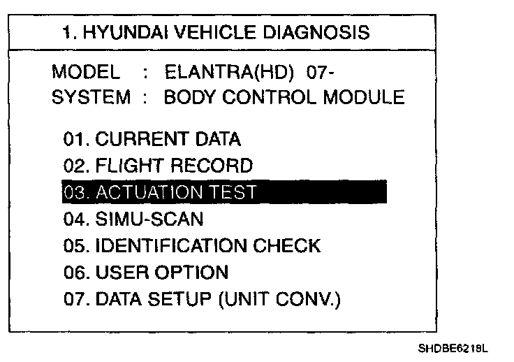 Home >> Hyundai >> 2007 >> Elantra L4-2.0L >> Repair and Diagnosis >> Powertrain Management >> Relays and Modules - Powertrain Management >> Relays and Modules - Computers and Control Systems >> Body Control Module >> Testing and Inspection >> Scan Tool Testing and Procedures >> BCM Diagnosis With Scantool