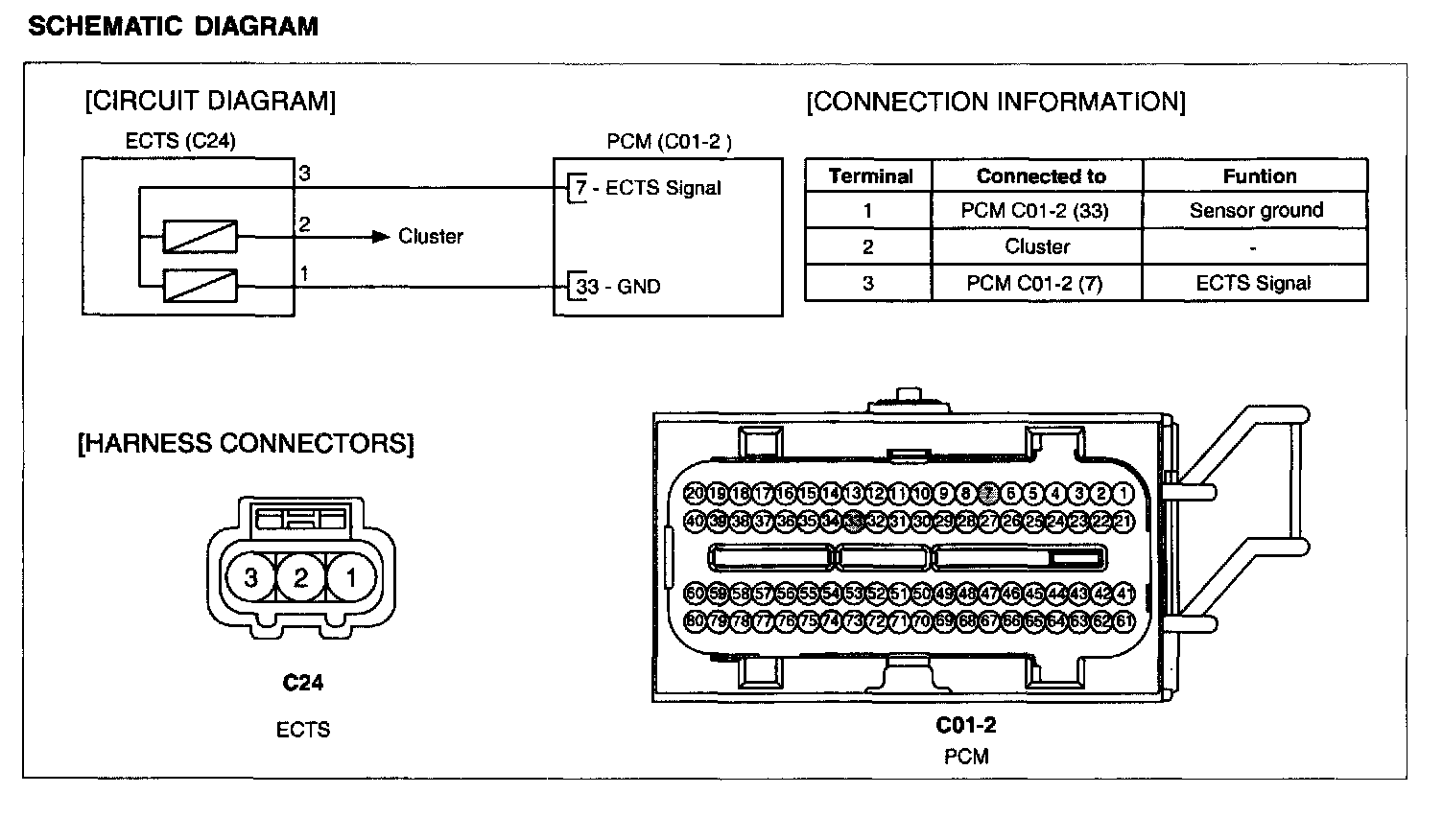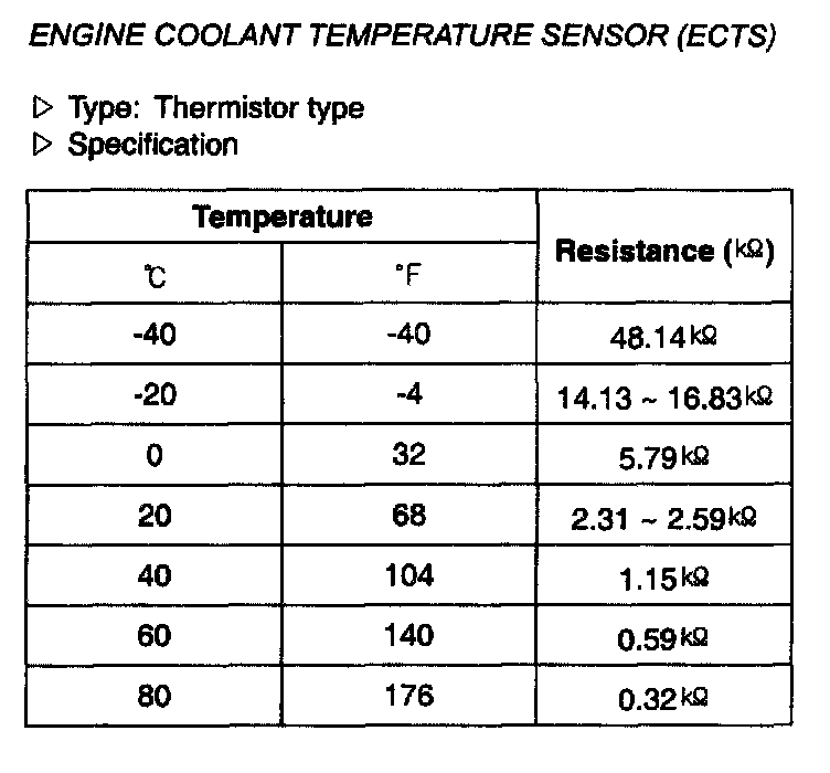 Engine Coolant Temperature Sensor (ECTS) is located in the engine coolant passage of the cylinder head for detecting the engine coolant temperature. The ECTS uses a thermistor whose resistance changes with the temperature. The electrical resistance of the ECTS decreases as the temperature increases, and increases as the temperature decreases. The reference 5 V in the PCM is supplied to the ECTS via a resistor in the PCM.That is, the resistor in the PCM and the thermistor in the ECTS are connected in series. When the resistance value of the thermistor in the ECTS changes according to the engine coolant temperature, the output voltage also changes. During cold engine operation the PCM increases the fuel injection duration and controls the ignition timing using the information of engine coolant temperature to avoid engine stalling and improve driveablity.