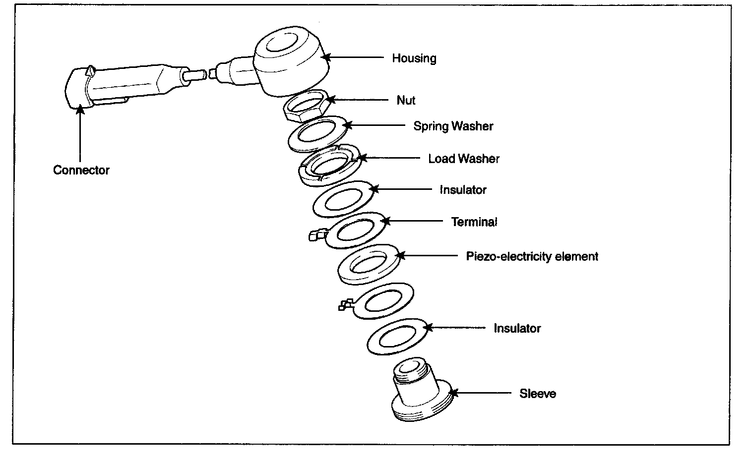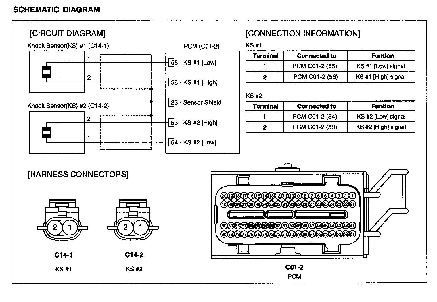 Knocking is a phenomenon characterized by undesirable vibration and noise and can cause engine damage. Knock Sensor (KS) senses engine knocking and the two sensors are installed inside the V-valley of the cylinder block. When knocking occurs, the vibration from the cylinder block is applied as pressure to the piezoelectric element. At this time, this sensor transfers the voltage signal higher than the specified value to the PCM and the PCM retards the ignition timing. If the knocking disappears after retarding the ignition timing, the PCM will advance the ignition timing. This sequential control can improve engine power, torque and fuel economy.