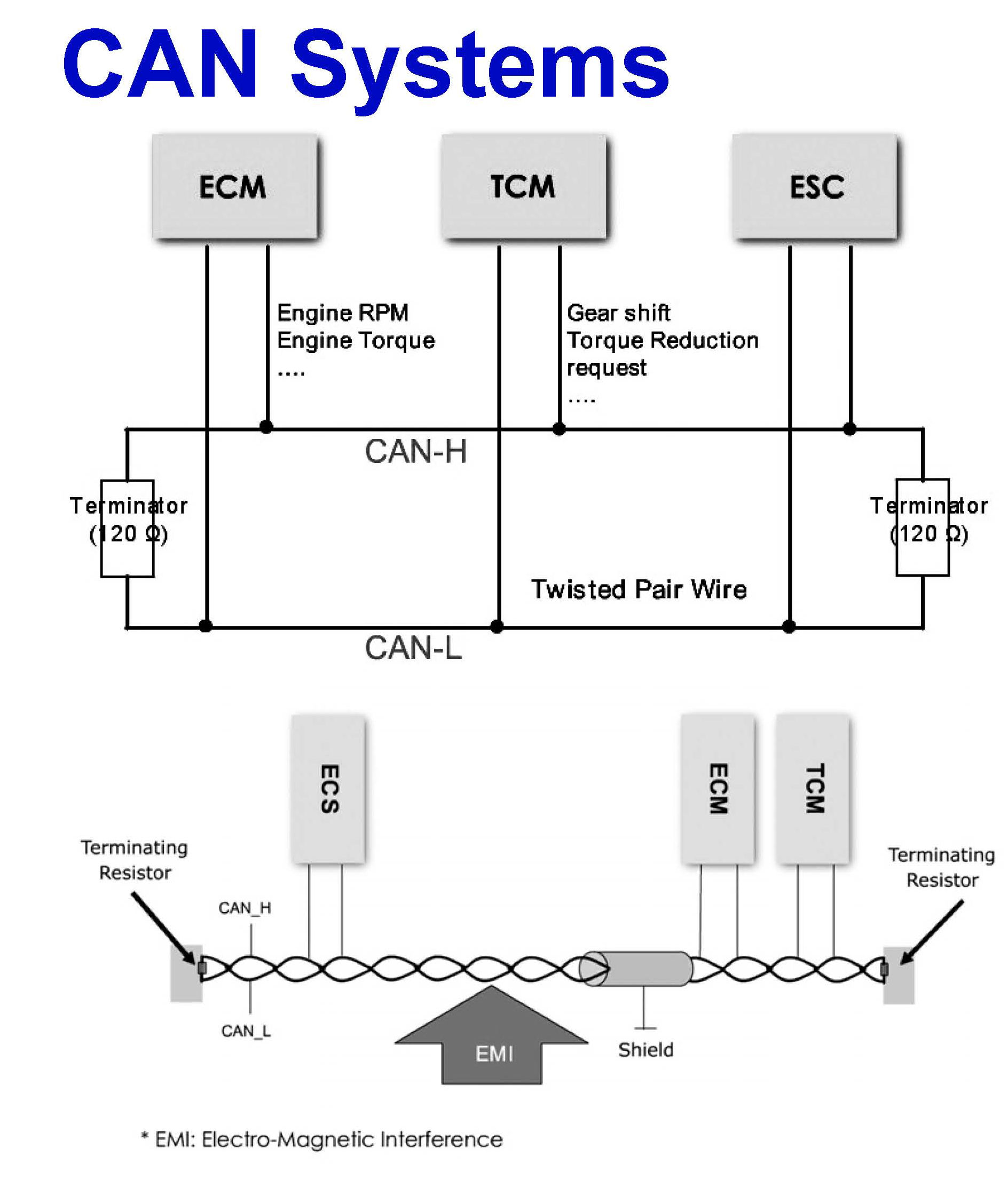 CAN-H and CAN-L represent the redundant wiring are terminating resistors. The resistors also compensate for varying distances between Control Modules and the resulting variances in resistance. These resistors can be located externally on the harness or inside a Control Module.