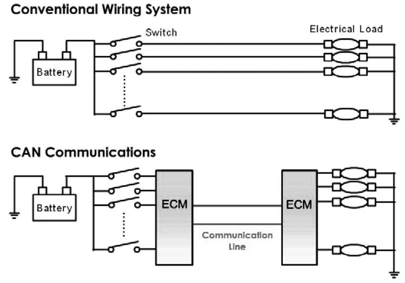 In the on-board network, control modules gather data from several sensors and actuators. The data is then assessed and responses are transferred through just one set of single or dual communication lines between the various control modules. This reduces the need for individual wires to run over the entire length between a switch and the load. (See Figure 2.)