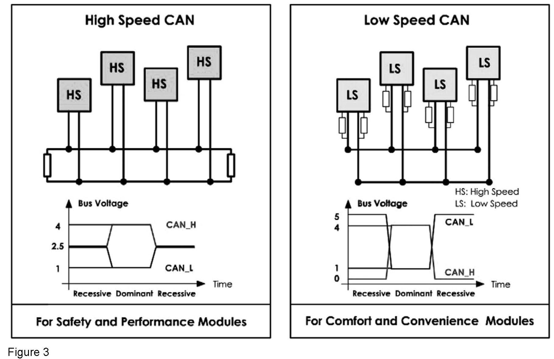 This is binary code for -1-. When the voltage goes above 3.5V on the high line and below 1.5V on the low line the binary code for -0- is indicated. The high and low lines will mirror each other. Note: High line and low line refer to the redundant communication lines in CAN and should not be confused with the high speed and low speed communication functions in the CAN system. (See Figure 3.)