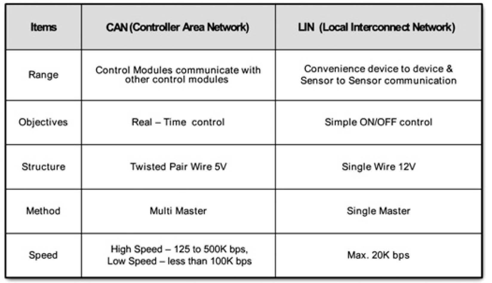 On some models such as the Entourage and 2008 Azera, both CAN and a Local Interconnect Network (LIN) are used with the Body Control Module. The LIN is a serial network; so communication moves in only one direction and is slower than CAN communication. LIN uses a signal that toggles between 0V and 12V. The table below contrasts the Controller Area Network and the Local Interconnect Network.