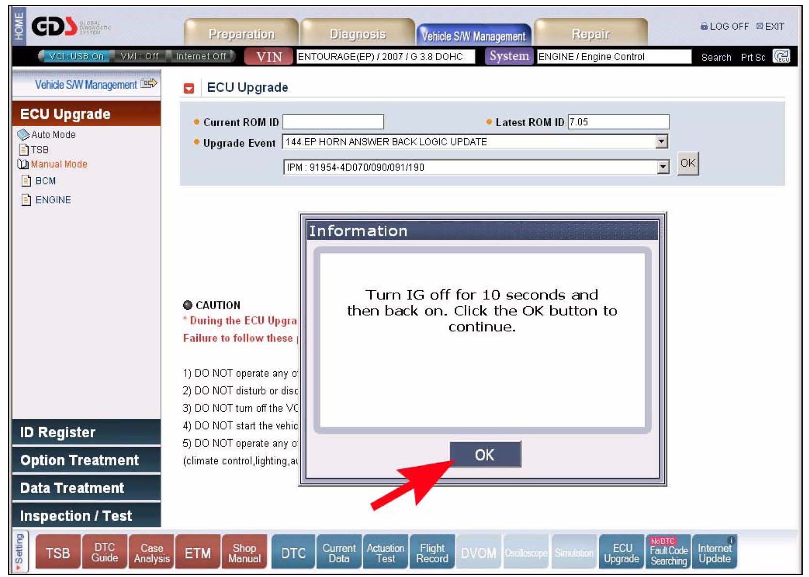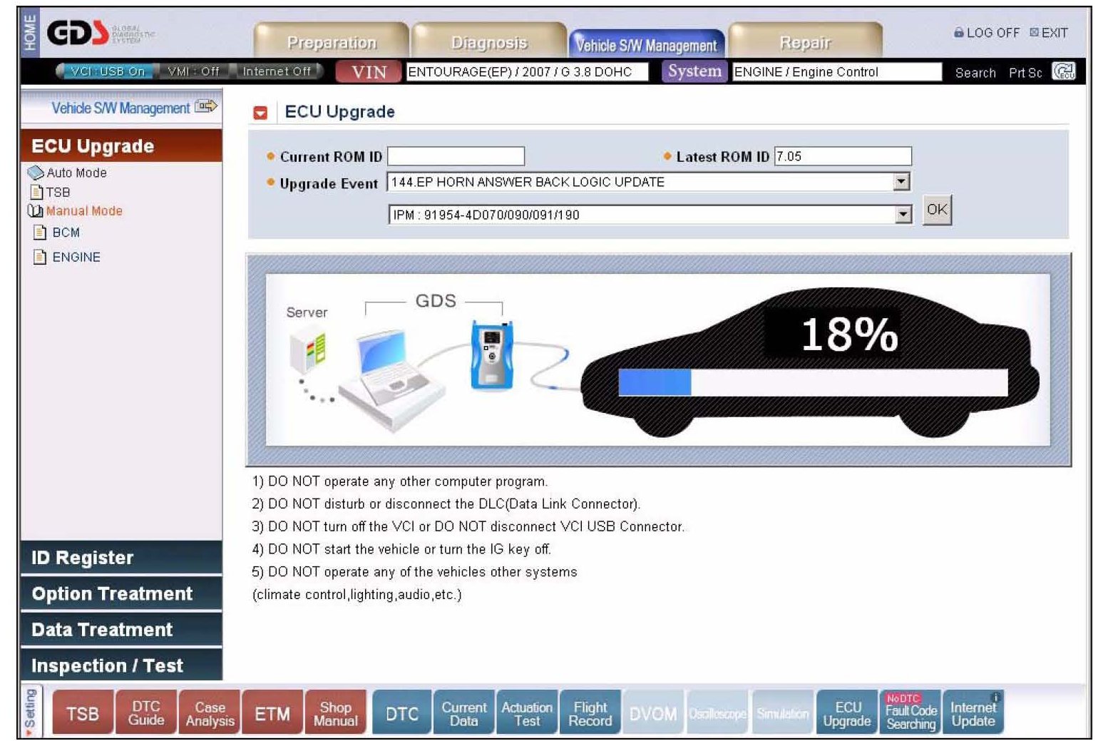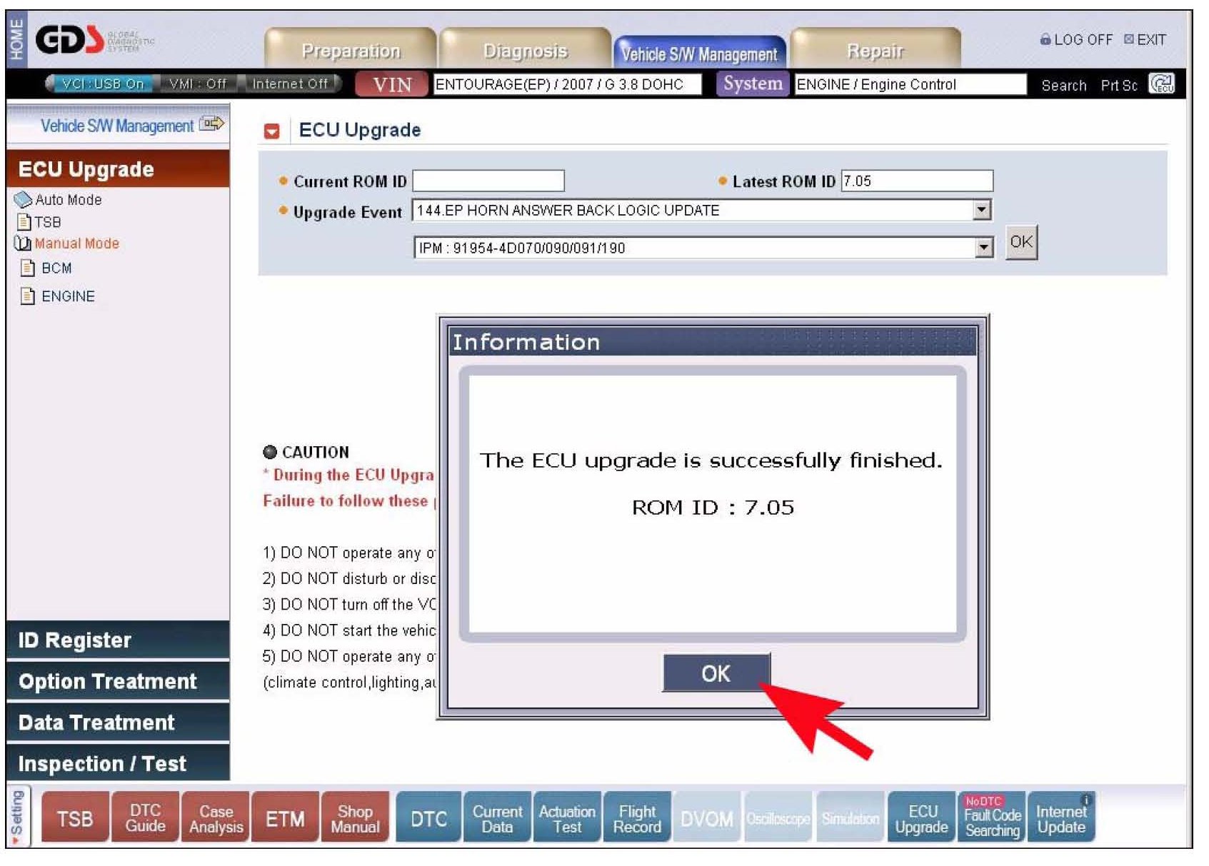 Home >> Hyundai >> 2007 >> Entourage V6-3.8L >> Repair and Diagnosis >> Relays and Modules >> Relays and Modules - Instrument Panel >> Instrument Panel Control Module >> Technical Service Bulletins >> Customer Interest >> Antitheft System - No Horn Chirp After IPM Replacement >> GDS ECU Software Reprogramming Procedure