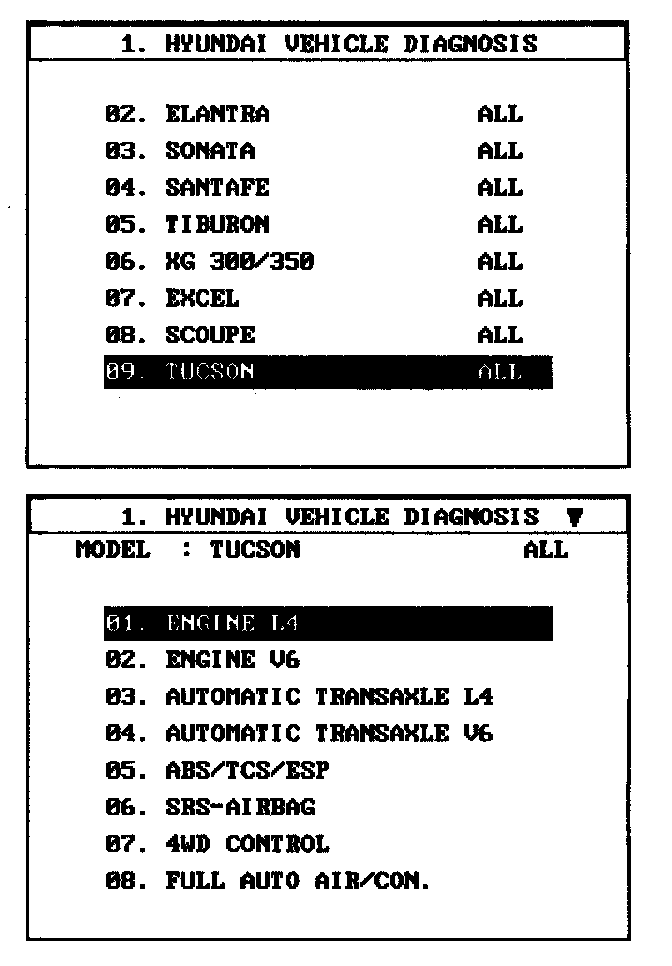 1. Select "Vehicle" and "Engine" (For example, TUC - SON 2.0L L4).