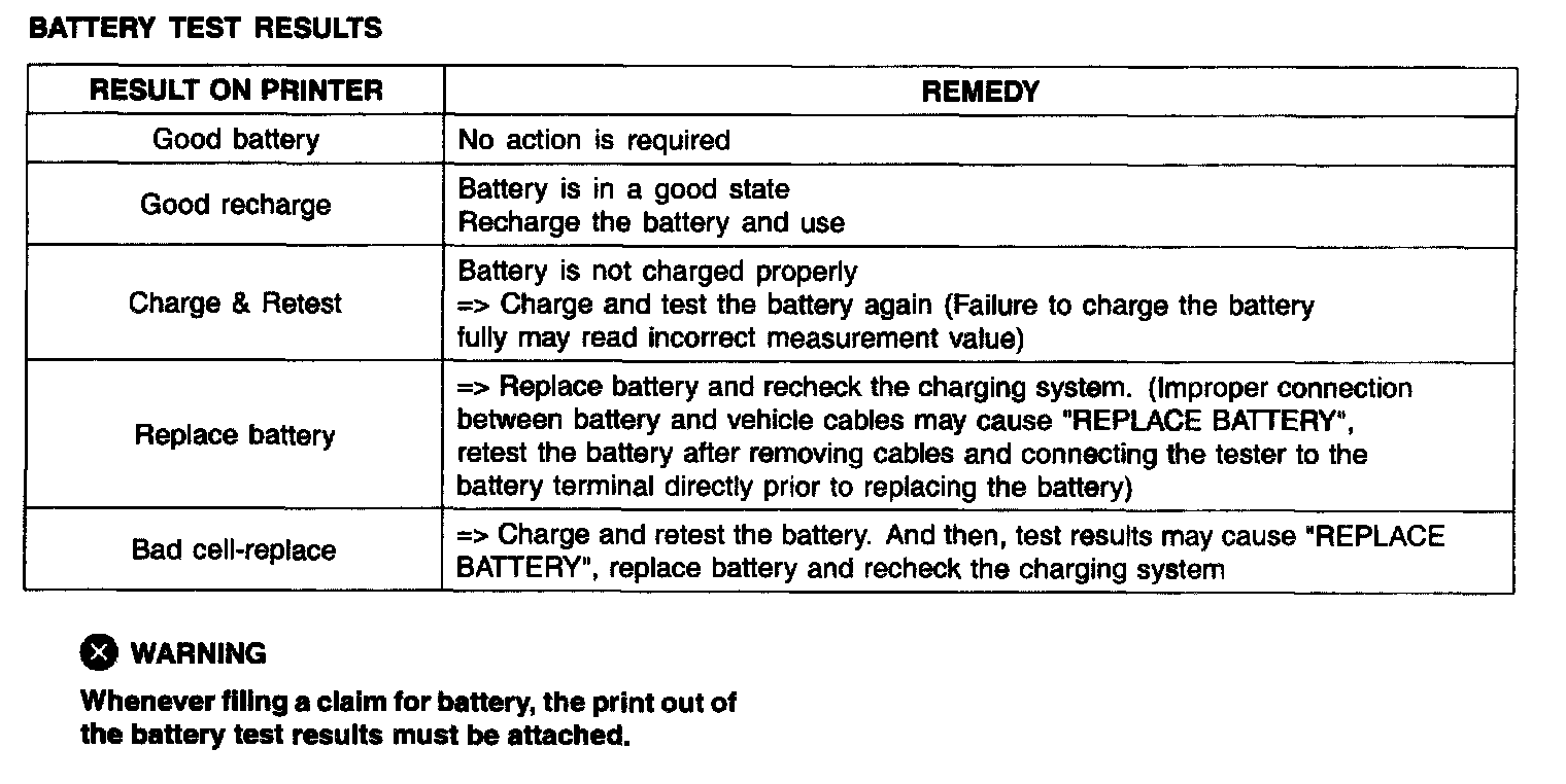 A relevant action must be given according to the test results by referring to the battery test results as shown in the table.