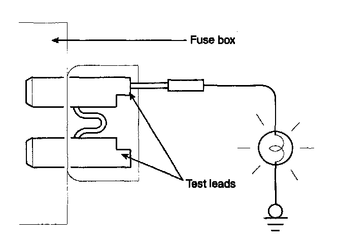 A blade type fuse test taps provided to allow checking the fuse itself without removing if from the fuse box. The fuse is good if the test lamp lights up when one lead is connected to the test taps (one at a time) and the other lead is grounded. (Turn the ignition switch so that the fuse circuit becomes operative)