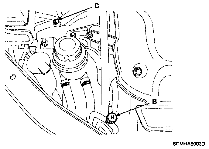 2. Connect an R-134a refrigerant Recovery/Recycling/Charging System (A) to the high-pressure service port (B) and the low-pressure service port (C) as shown, following the equipment manufacturer's instructions.