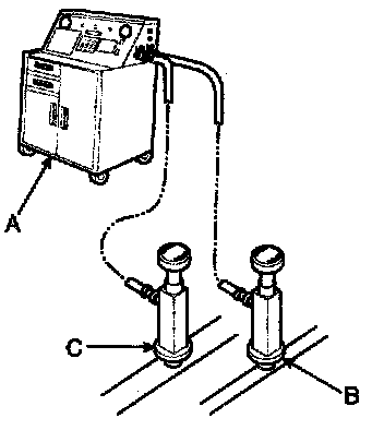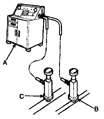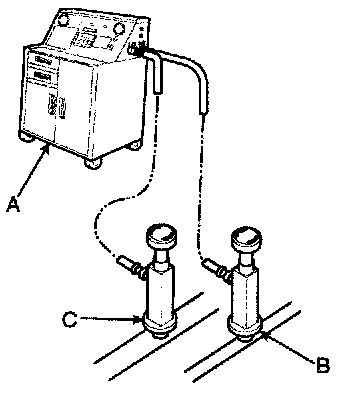 Recovery/Recycling/Charging System (A) to the high-pressure service port (B) and the low-pressure service port (C) as shown, following the equipment manufacturer's instructions.