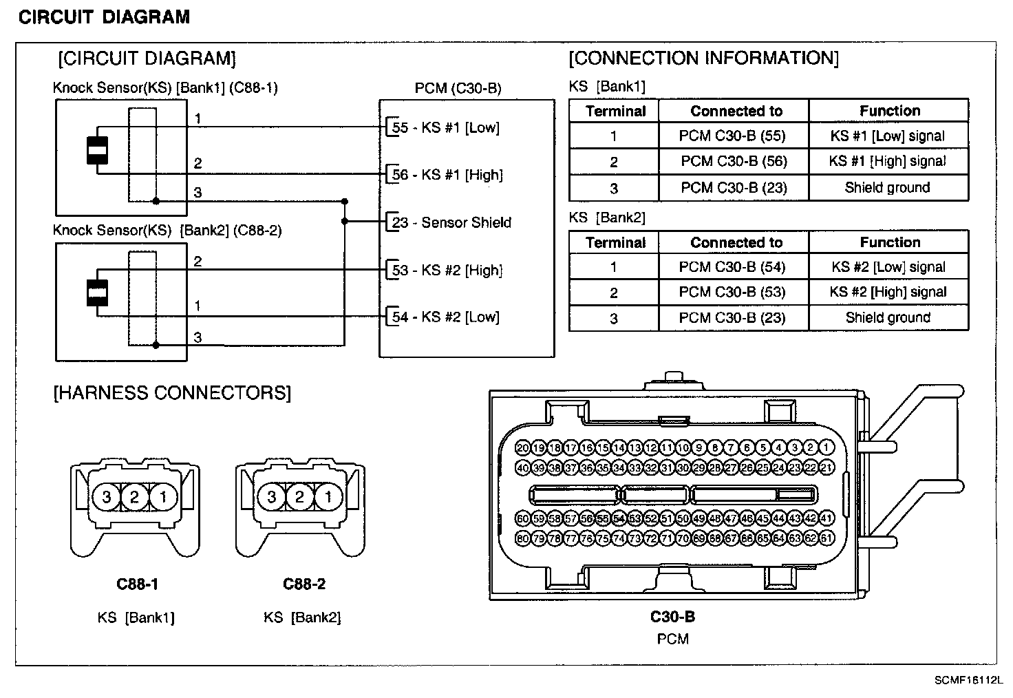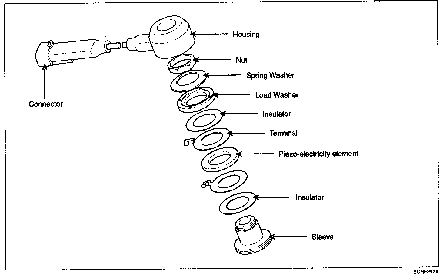 Knocking is a phenomenon characterized by undesirable vibration and noise and can cause engine damage. Knock Sensor (KS) senses engine knocking and the two sensors are installed inside the V-valley of the cylinder block. When knocking occurs, the vibration from the cylinder block is applied as pressure to the piezoelectric element. At this time, this sensor transfers the voltage signal higher than the specified value to the PCM and the PCM retards the ignition timing. If the knocking disappears after retarding the ignition thing, the PCM will advance the ignition timing. This sequential control can improve engine power, torque and fuel economy.