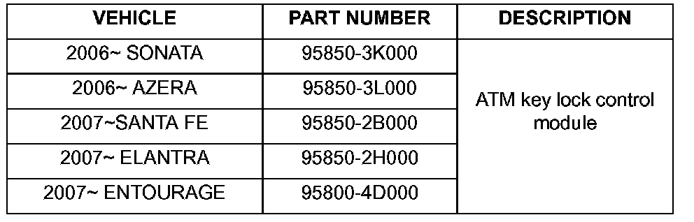 Home >> Hyundai >> 2007 >> Santa Fe AWD V6-2.7L >> Repair and Diagnosis >> Powertrain Management >> Transmission Control Systems >> Relays and Modules - Transmission and Drivetrain >> Relays and Modules - A/T >> Shift Interlock Control Module >> Technical Service Bulletins >> All Technical Service Bulletins >> A/T - Can't Shift Into/Out Of 'PARK'