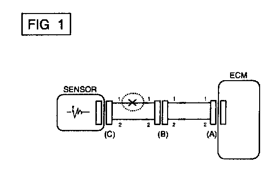 In[FIG.2] the measured resistance of line 1 and 2 is higher than 1 Mohm and below 1 ohm respectively. Specifically the open circuit is line 1 (Line 2 is normal). To find exact break point, check sub line of line 1 as described in next step.