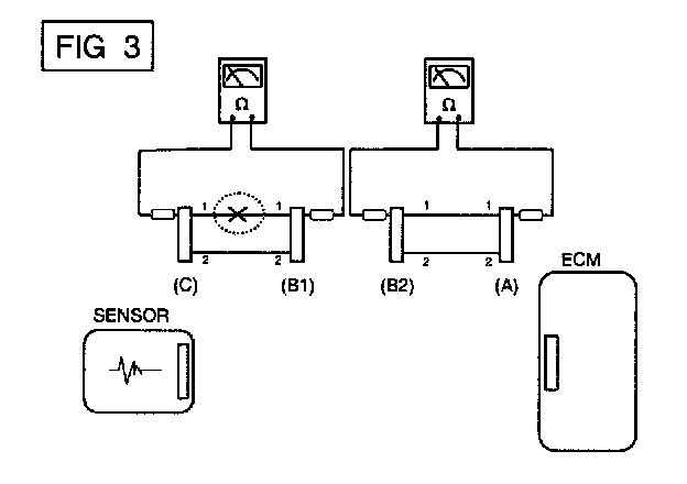 b. Disconnect connector (B), and measure for resistance between connector (C) and (B1) and between (82) and (A) as shown in [FIG. 3].