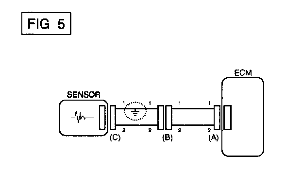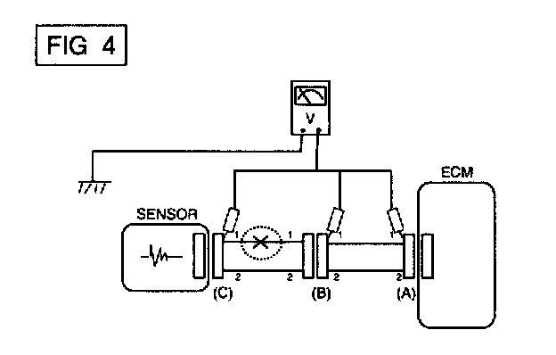 a. With each connector still connected, measure the voltage between the chassis ground and terminal 1 of each connectors (A), (B) and (C) as shown in [FIG. 4].
