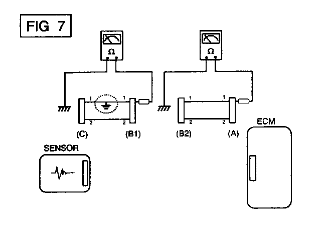 b. Disconnect connector (B), and measure the resistance between connector (A) and chassis ground, and between (B1) and chassis ground as shown in [FIG. 7].