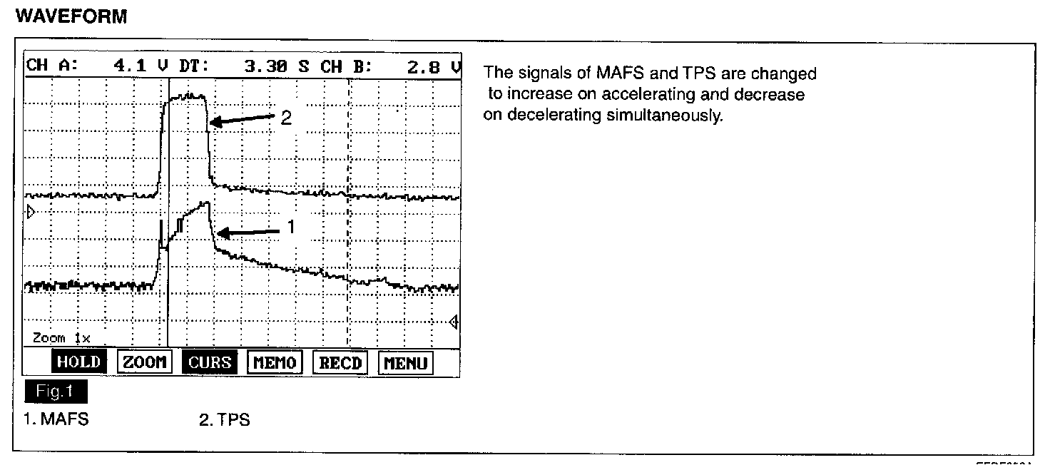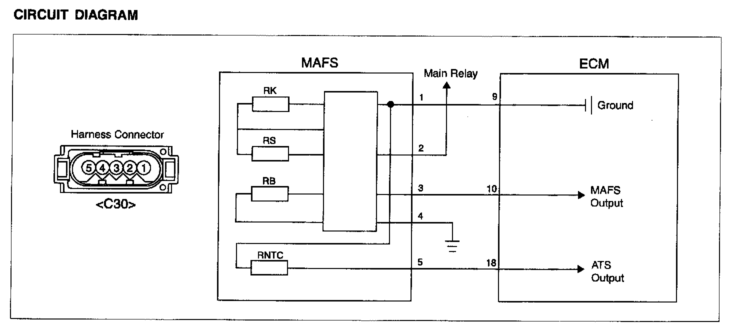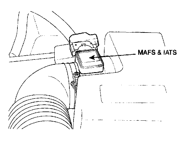 The Mass Air Flow Sensor (MAFS) is located between the air cleaner assembly and the throttle body. The MAFS uses a hot film type sensing element to measure the mass of intake air entering the engine. Mass air flow rate is measured by detecting of heat transfer from a hot film probe. The change in air flow rate causes change in the amount of heat being transferred from the hot film probe surface to the air. A large amount of intake air represents acceleration or high load conditions while a small amount of Intake air represents deceleration or idle. The ECM uses this information to determine the injection duration and ignition timing for the desired air/fuel ratio.