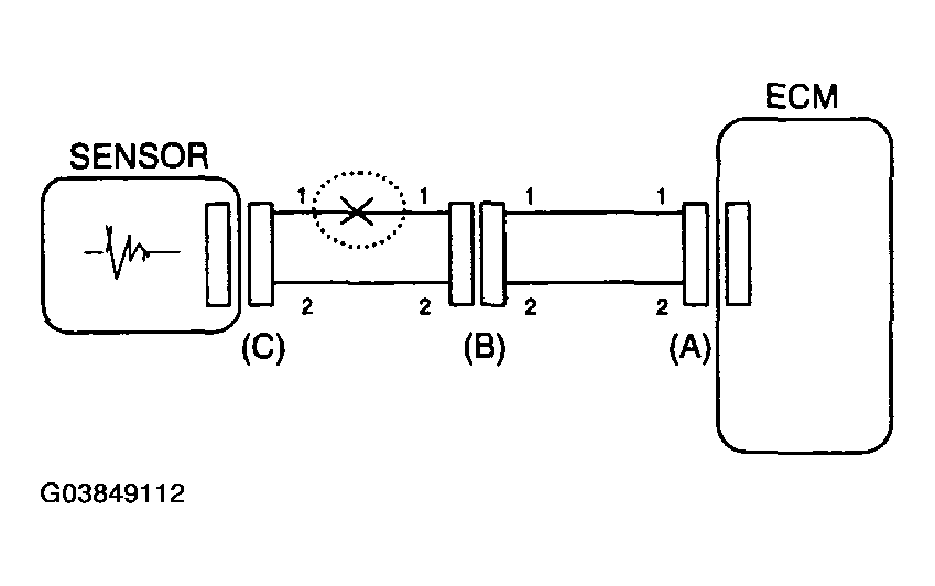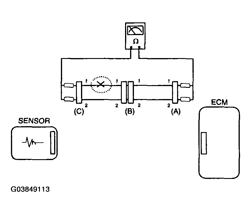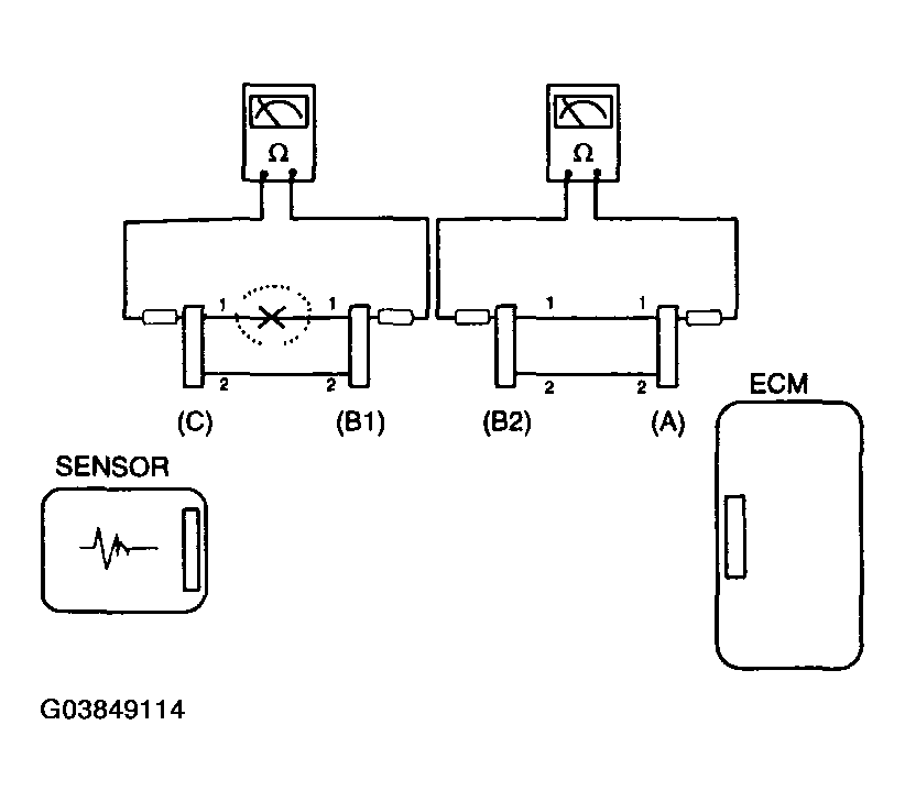 In this case the measured resistance between connector (C) and (B1) is higher than 1 MΩ and the open circuit is between terminal 1 of connector (C) and terminal 1 of connector (B1).