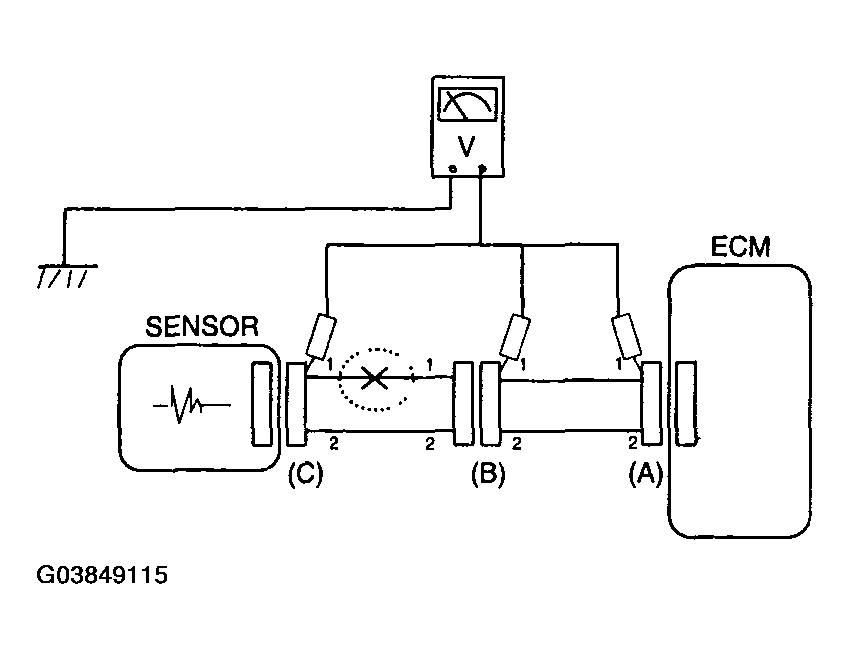 - With each connector still connected, measure the voltage between the chassis ground and terminal 1 of each connectors (A), (B) and (C) as shown in [Fig 4].