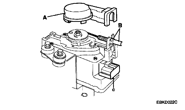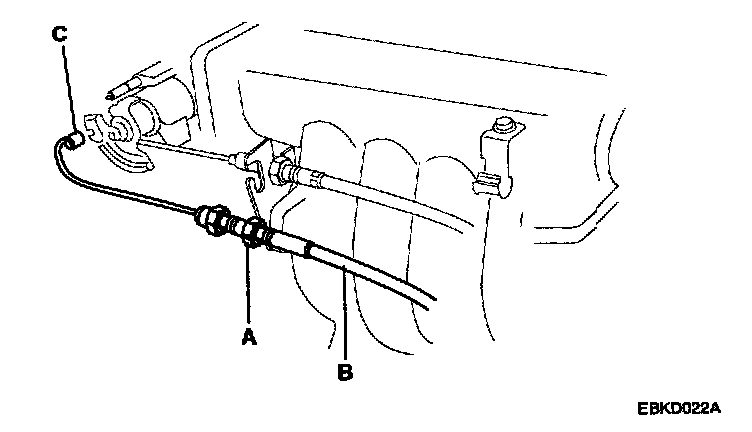CRUISE CONTROL UNIT AND CABLE1. Loosen the locknuts (A) and disconnect the actuator cable (B) from the throttle linkage(C).