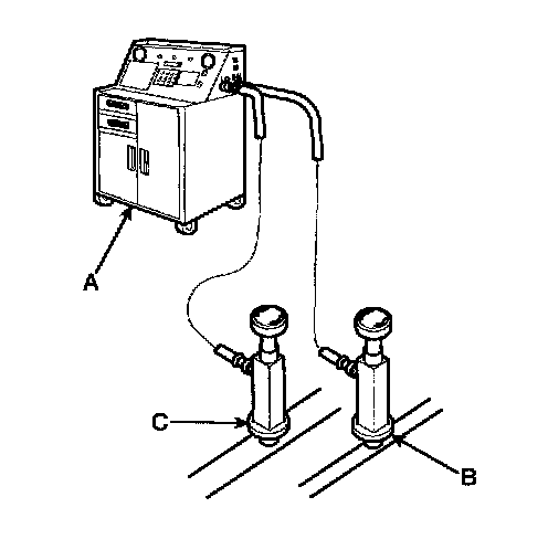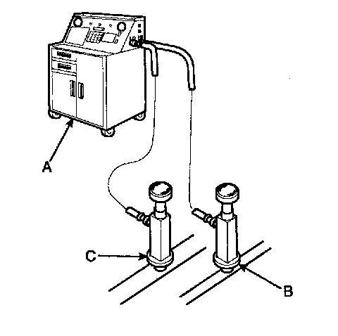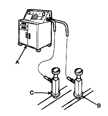 2. Connect an R-134a refrigerant Recovery/Recycling/Charging System (A) to the high-pressure service port (B) and the low-pressure service port (C) as shown, following the equipment manufacturer's instructions.