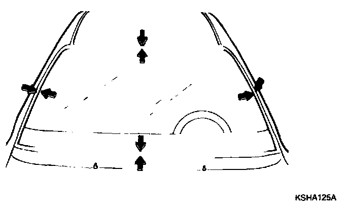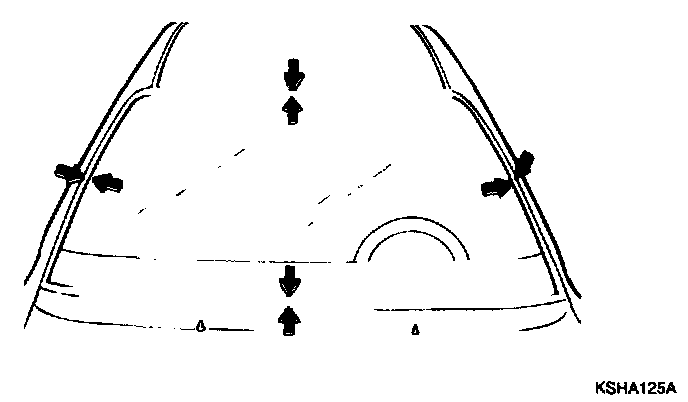 4. Center a new windshield glass in the opening. Mark the location by marking lines across the glass and body with a grease pencil at the four points as shown.