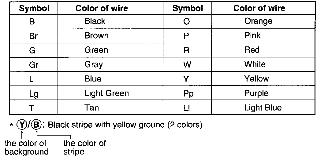 The following abbreviations are used to identify wire colors in the circuit schematics.