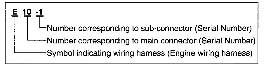 A connector identification symbol consists of a wiring harness location classification symbol corresponding to a wiring harness location and number corresponding to the connector.