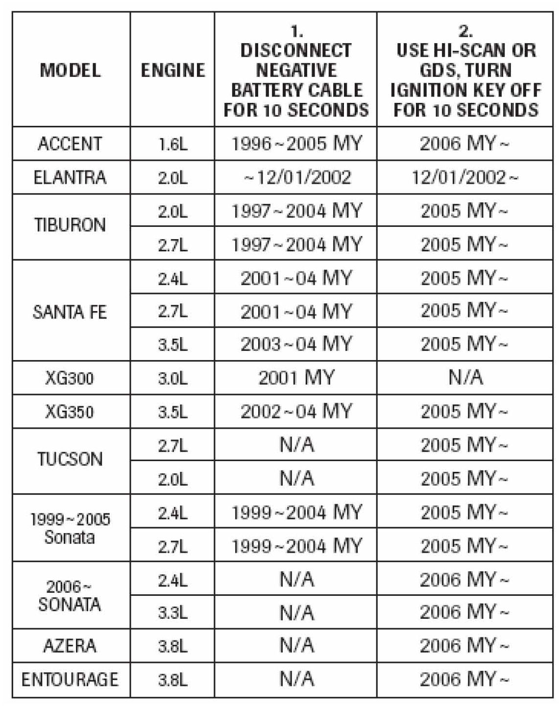 ^ Reprogram or swap PCM/TCM from another vehicle Adaptive values must be reset using procedure # 1 or # 2 according to model and model year (MY) as shown below.