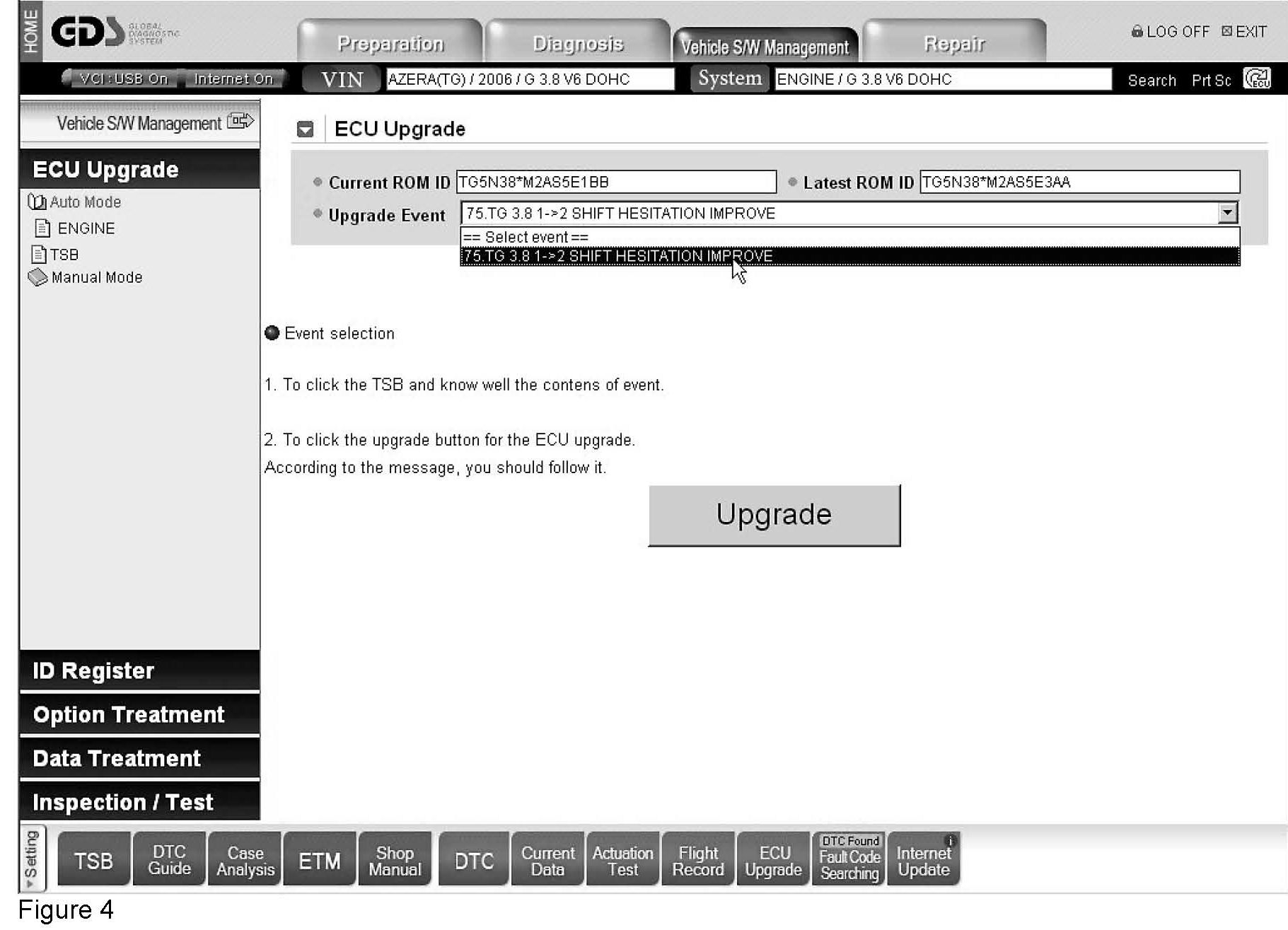 This issue of TechNet Times focuses on reprogramming. In the current Hyundai service environment, reprogramming can be accomplished with the Hi-Scan Pro or Hyundai's new Global Diagnostic System (GDS). We begin here with an overview of the process of reprogramming the ECU as performed using the GDS on a 2006 Azera that experiences a 1-2 shift hesitation under wide open throttle operation when cold. As with most GDS features, you must select the model, year and system in order to get started. You can manually enter the information by selecting drop-down box options or, if the vehicle is a 2005 or newer model, you can enter the VIN and the GDS will determine that information for you. Once the vehicle has been identified, select "ECU Upgrade" located under the "Vehicle SW Management" tab. (See Figure 1.) Note: The Vehicle Communication Interface (VCI) connects to the vehicle via the Data Link Connector (DLC); and the VCI must be connected to the GDS PC using the USB connection. (Some other GDS functions allow for wireless communication between the VCI and GDS PC.)