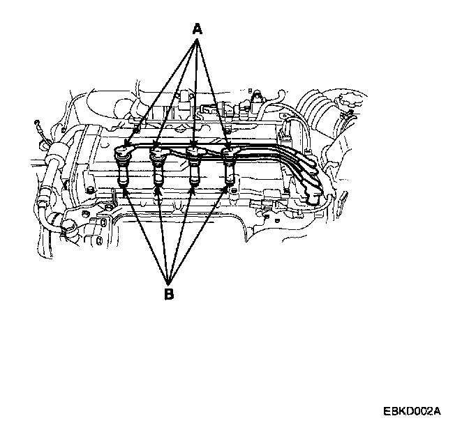 Check the condition of the spark plug cable terminals(B), if any terminal is corroded, clean it, and if it broken or distorted, replace the spark plug cable.