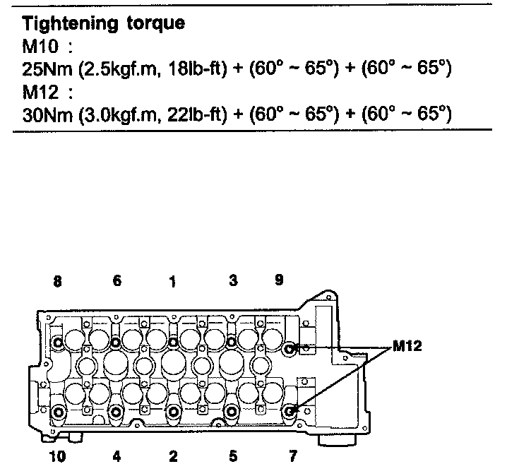 Retighten the bearing cap bolts by (60° - 65°) in the numerical order shown.