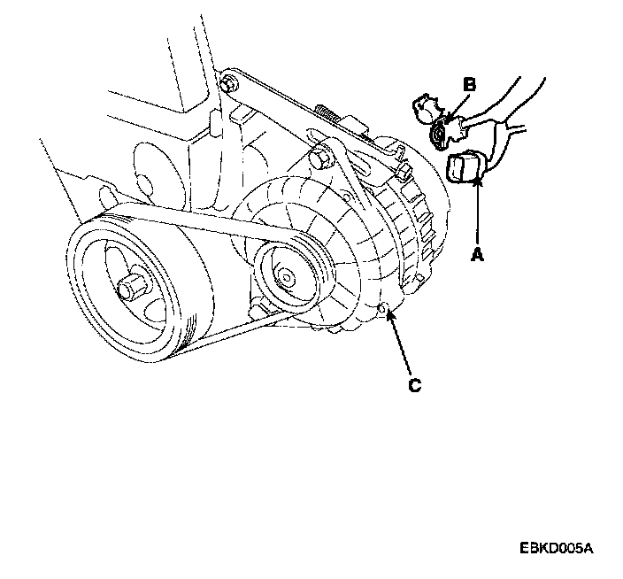 2. Disconnect the alternator connector(A) and "B" terminal cable(B) from the alternator(C).