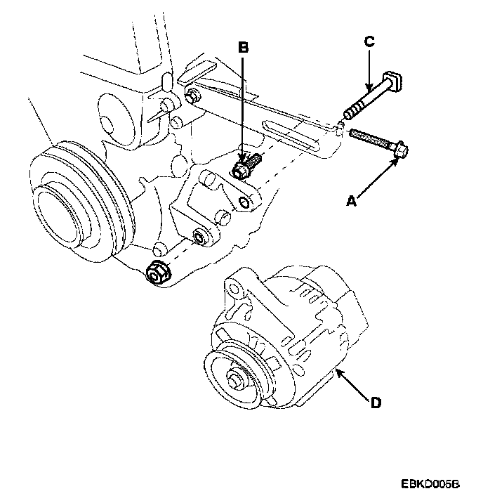 4. Pull out the through bolt(C), then remove the alternator(D).