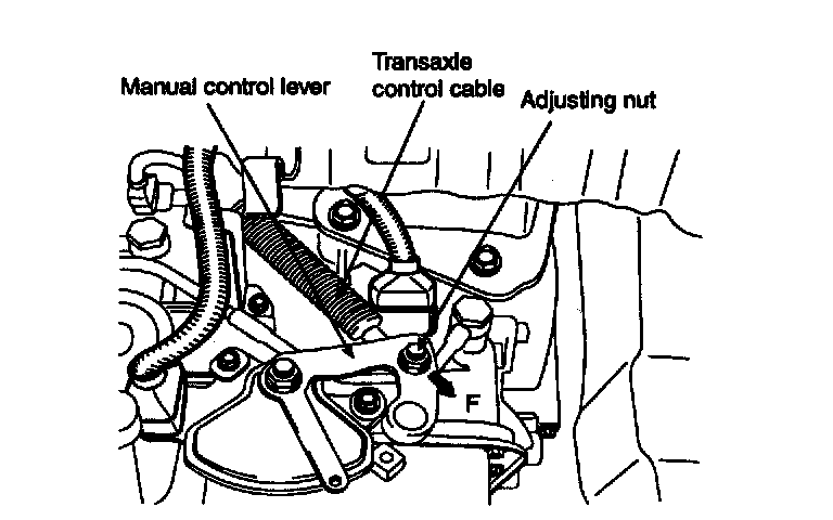 6. Gently pull the transmission control cable in the direction of the arrow, and then tighten the adjusting nut.