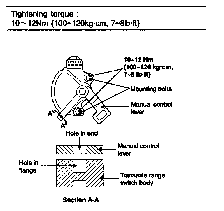 4. Loosen the transaxle range switch body mounting bolts and then turn the transaxle range switch body so the hole in the end of the manual control lever and the hole (cross section A-A in the figure) in the flange of the transaxle range switch body flange are aligned.