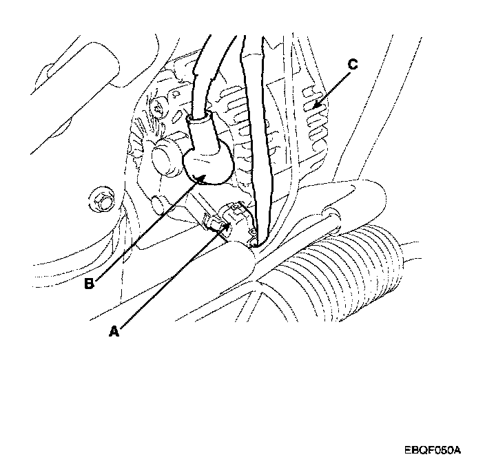 2. Disconnect the alternator connector(A) and "B" terminal cable(B) from the alternator(C).