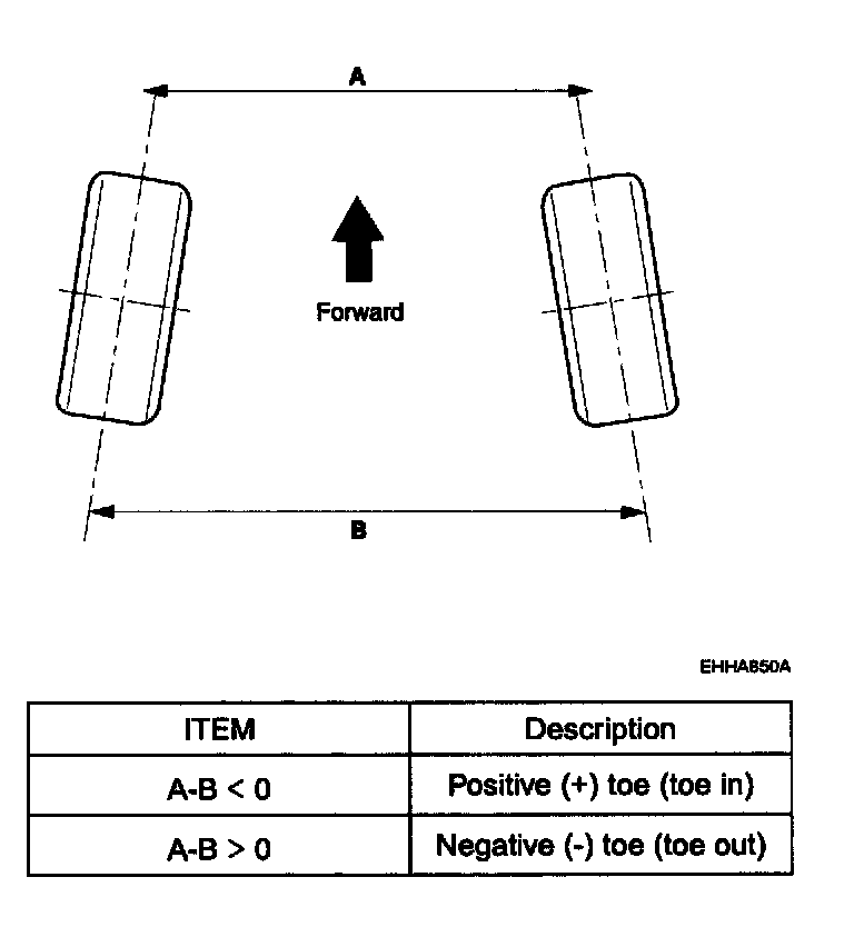 When the wheels are turned in toward the front of the vehicle, toe is positive (+) (toe inch). When the wheels are turned out toward the front of the vehicle, toe is negative (-) (toe out). Toe is measured in degrees, from side to side, and totaled. Toe-in (B-A or angle a+b) is adjusted by turning the tie rod turnbuckles.