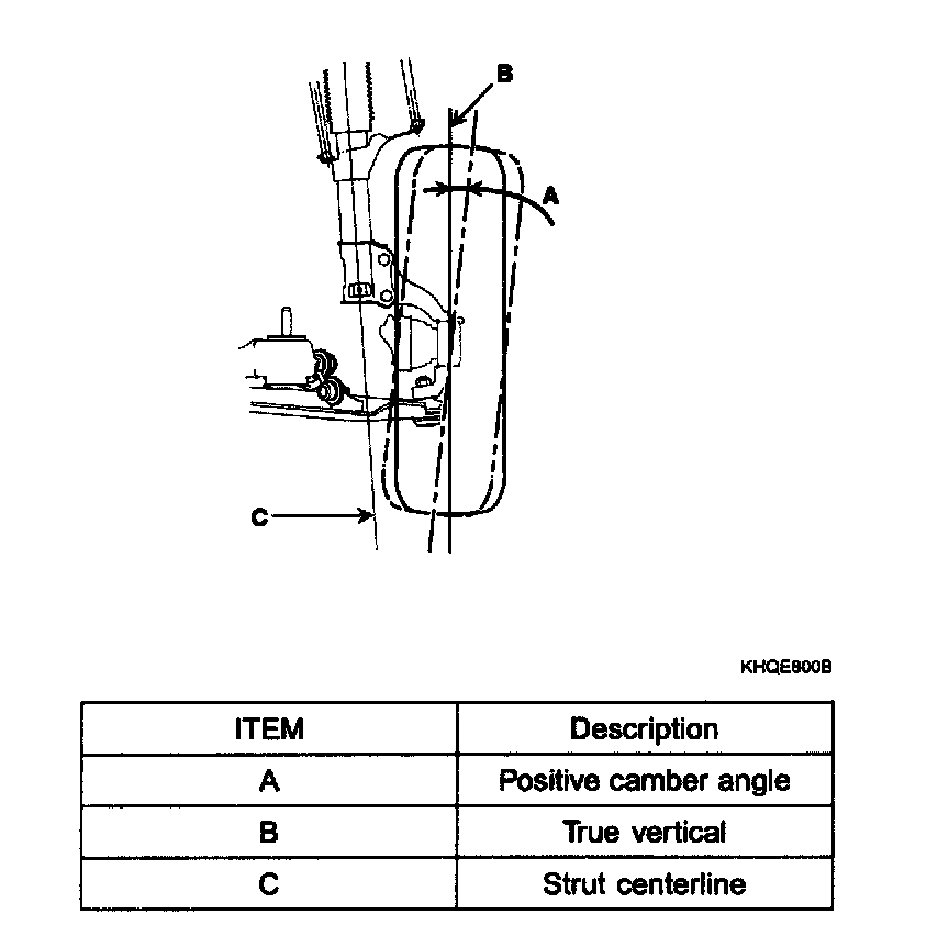 Caster is the tilting of the strut axis either forward or backward from vertical. A backward tilt is positive (+) and a forward tilt is negative (-).