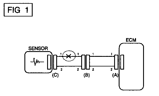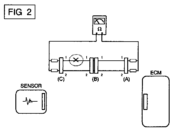 In [FIG.2.] the measured resistance of line 1 and 2 is higher than 1 Mohm and below 1 ohm respectively. Specifically the open circuit is line 1 (Line 2 is normal). To find exact break point, check sub line of line 1 as described in next step.