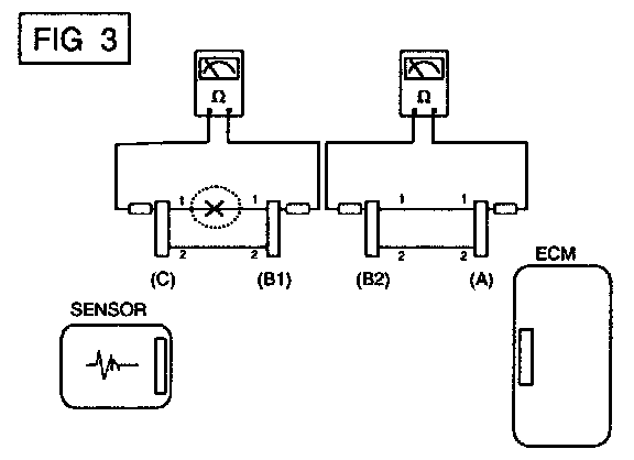 b. Disconnect connector (B), and measure for resistance between connector (C) and (B1) and between (B2) and (A) as shown in [FIG. 3].