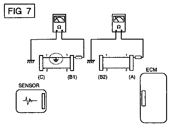 b. Disconnect connector (B), and measure the resistance between connector (A) and chassis ground, and between (B1) and chassis ground as shown in [FIG. 7].