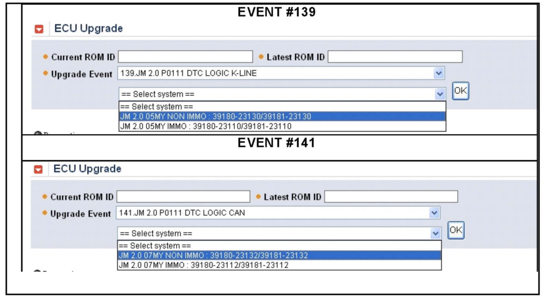 1. Within the ECM Upgrade screen, select Manual Mode in the left column, then select Upgrade Event #139 and #141. Select the appropriate control unit part number with reference to the ROM ID information table and click OK.
