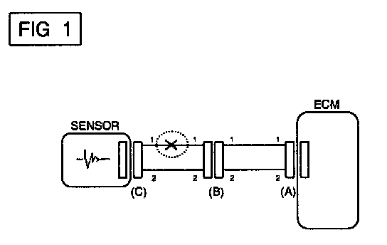 In [FIG.2.] the measured resistance of line 1 and 2 is higher than 1 Mohm and below 1 ohm respectively. Specifically the open circuit is line 1 (Line 2 is normal). To find exact break point, check sub line of line 1 as described in next step.