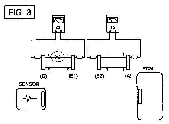 b. Disconnect connector (B), and measure for resistance between connector (C) and (B1) and between (B2) and (A) as shown in [FIG. 3].