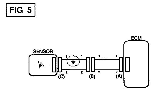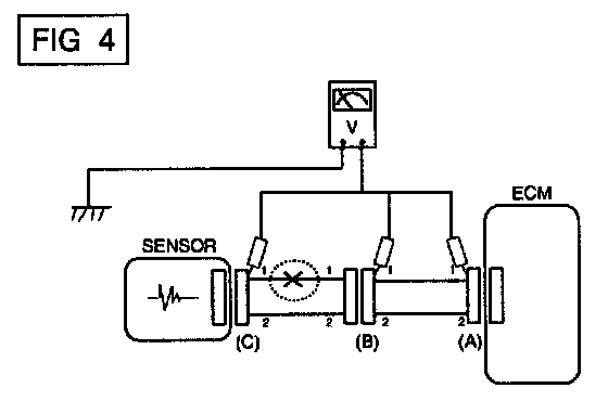 a. With each connector still connected, measure the voltage between the chassis ground and terminal 1 of each connectors (A), (B) and (C) as shown in [FIG. 4].