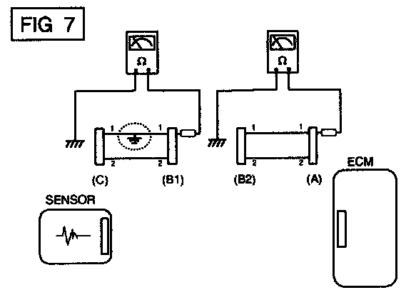 b. Disconnect connector (B), and measure the resistance between connector (A) and chassis ground, and between (B1) and chassis ground as shown in [FIG. 7].