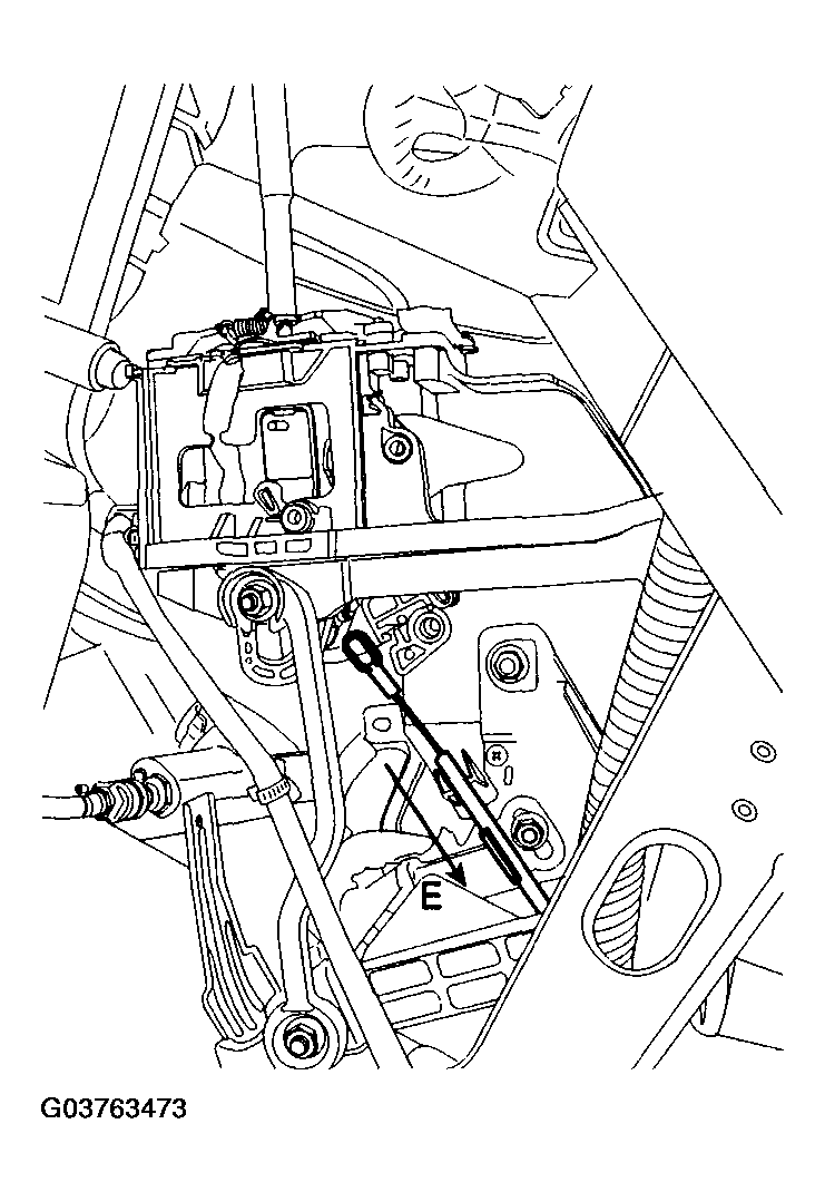 - Doing the work of 3. slightly pull outer casing of shift lock cable to direction "E" to stretch cable. In this case, shift lock cam must not move.