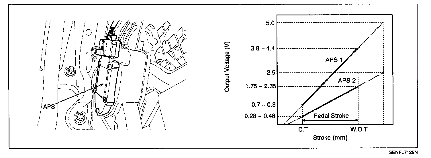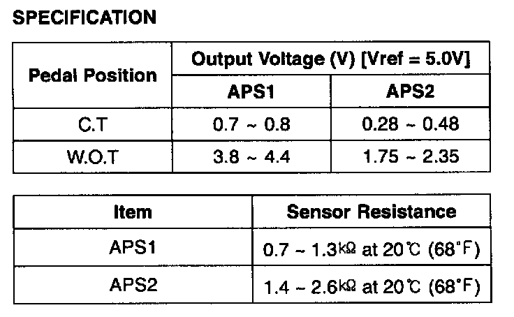 Accelerator Position Sensor (APS) is installed on the accelerator pedal module detects the rotation angle of the accelerator pedal. APS is one of the most important sensors in engine control system, so it consists of the two sensors which adapt individual sensor power and ground line. The second sensor monitors the first sensor and its output voltage is half of the first one. If the ratio of the sensor 1 and 2 is out of the range (approximately 1/2), the diagnostic system judges that it is abnormal.