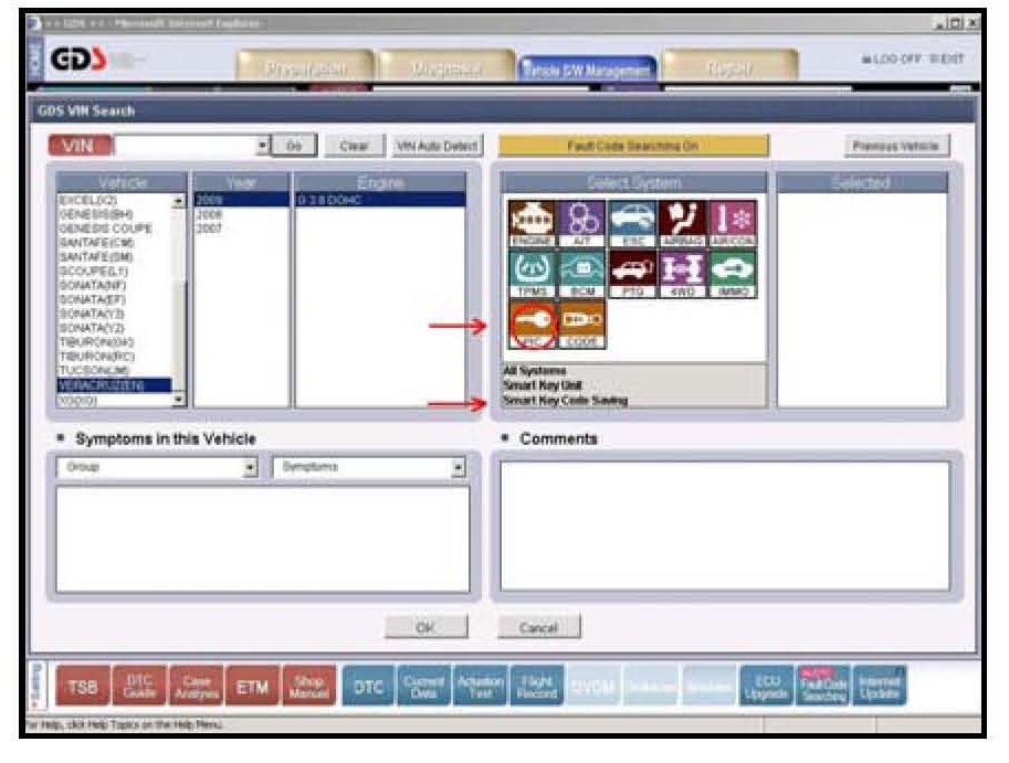1. Connect the GDS unit to the vehicle and select the vehicle model and PIC (Smart Key Code Saving) option from the VIN screen.