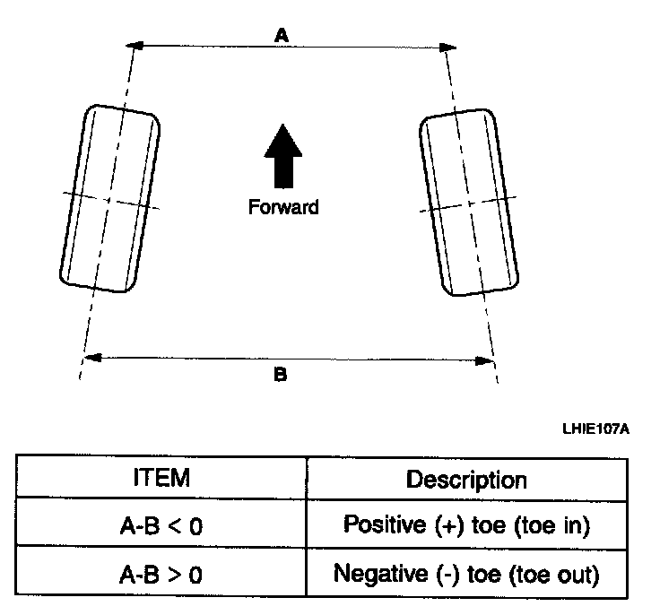 When the wheels are turned in toward the front of the vehicle, toe is positive (+) (toe in). When the wheels are turned out toward the front of the vehicle, toe is negative (-) (toe out). Toe is measured in degrees, from side to side, and totaled.